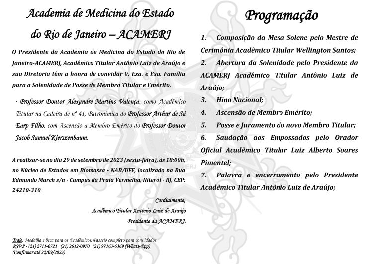 CONVITE - SESSÃO SOLENE DE POSSE DE ACADÊMICO TITULAR E EMÉRITO