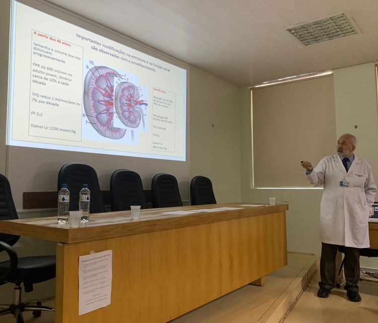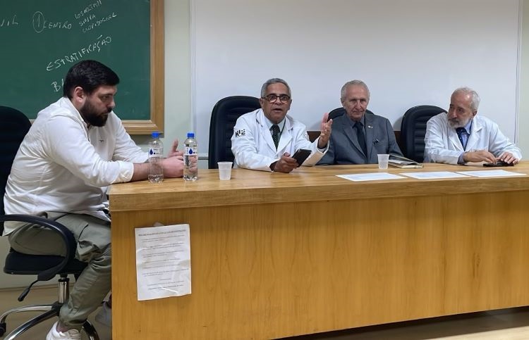 Diante de uma plateia numerosa e interessada, composta por alunos do Curso Anual de Hemodinâmica e Intervenções Percutâneas da UERJ — organizado pelo Prof. Esmeralci e ministrado por ele e outros professores e médicos convidados —, o Acadêmico Younes conduziu a palestra de forma didática, explorando profundamente os conhecimentos sobre injúria renal aguda (IRA) induzida por contrastes utilizados em investigações cardiovasculares.