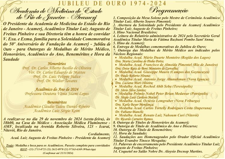 A Academia do Estado do Rio de Janeiro - Acamerj, com grande satisfação, convida os Acadêmicos e Acadêmicas e a comunidade médica para a Solenidade de Jubileu de Ouro, um marco importante para nossa instituição.