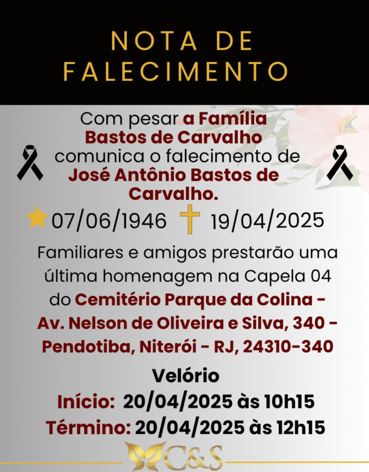 Em anexo, o comunicado da família com as informações sobre o velório, que ocorrerá no Parque da Colina, em Niterói e Missa de Sétimo Dia a ser celebrada.