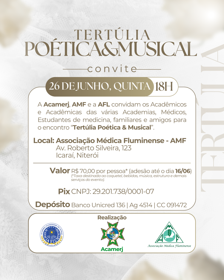 Convidamos todos para uma noite especial de arte, cultura e convivência. No dia 26 de junho de 2025, às 18h, será realizada uma Tertúlia, organizada em parceria com a Associação Médica Fluminense (AMF) e a Academia Fluminense de Letras (AFL).