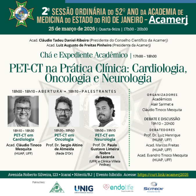 A Academia de Medicina do Estado do Rio de Janeiro - Acamerj tem o prazer de convidar os Confrades e Confreiras, a comunidade médica e o público interessado para a Sessão Ordinária "PET-CT na prática clínica: Cardiologia, Oncologia e Neurologia", a realizar-se em 25 de março a partir das 17h.
