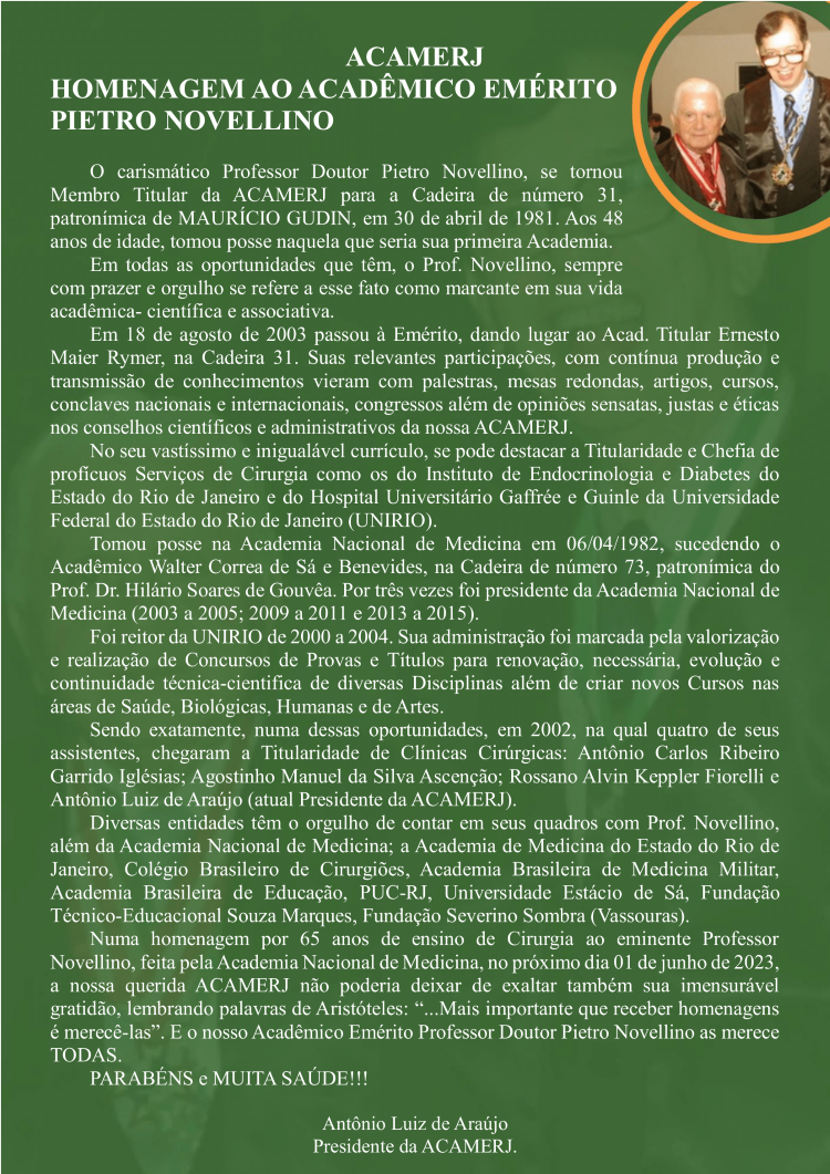 A Academia de Medicina do Estado do Rio de Janeiro une-se nas homenagens da Academia Nacional de Medicina ao Prof. Pietro Novellino.