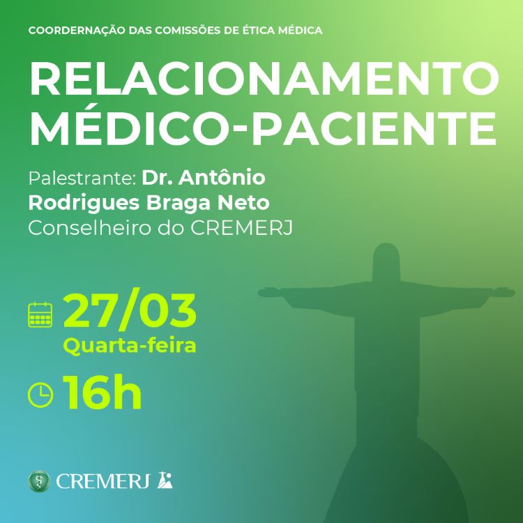 O Conselho Regional de Medicina do Estado do Rio de Janeiro (CREMERJ), por meio da Coordenação de Comissões de Ética Médica (COCEM), tem o prazer de anunciar um importante evento para médicos e acadêmicos de medicina do Estado do Rio de Janeiro: o Webinar COCEM - Relacionamento Médico x Paciente. Este evento exclusivo será realizado no dia 27 de março de 2024, quarta-feira, às 16h, e transmitido ao vivo via YouTube.
