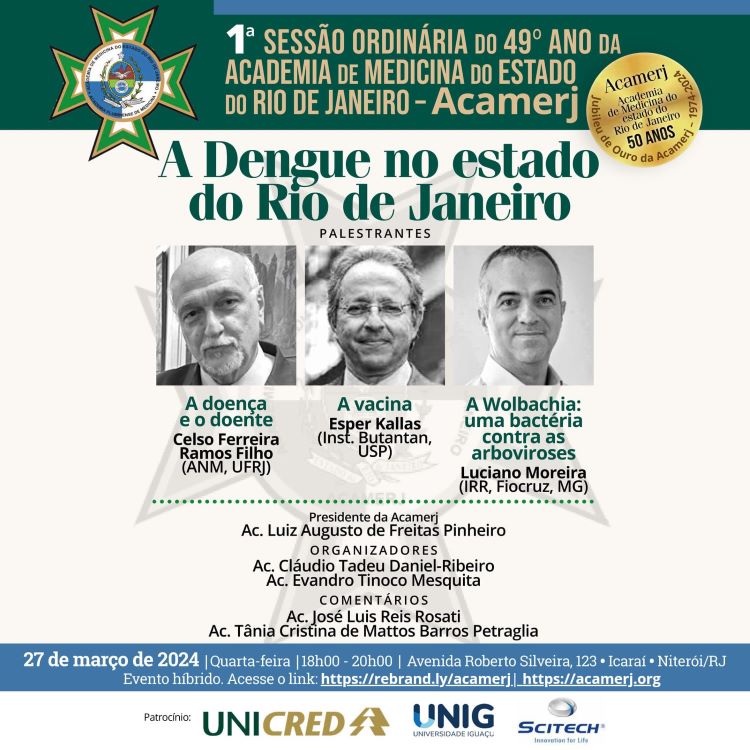 A Academia de Medicina do Estado do Rio de Janeiro - Acamerj tem o prazer de convidar os Confrades e Confreiras, a comunidade médica e o público interessado para o evento "A Dengue no estado do Rio de Janeiro", a realizar-se em 27 de março a partir das 18h. A programação e cartaz segue abaixo.