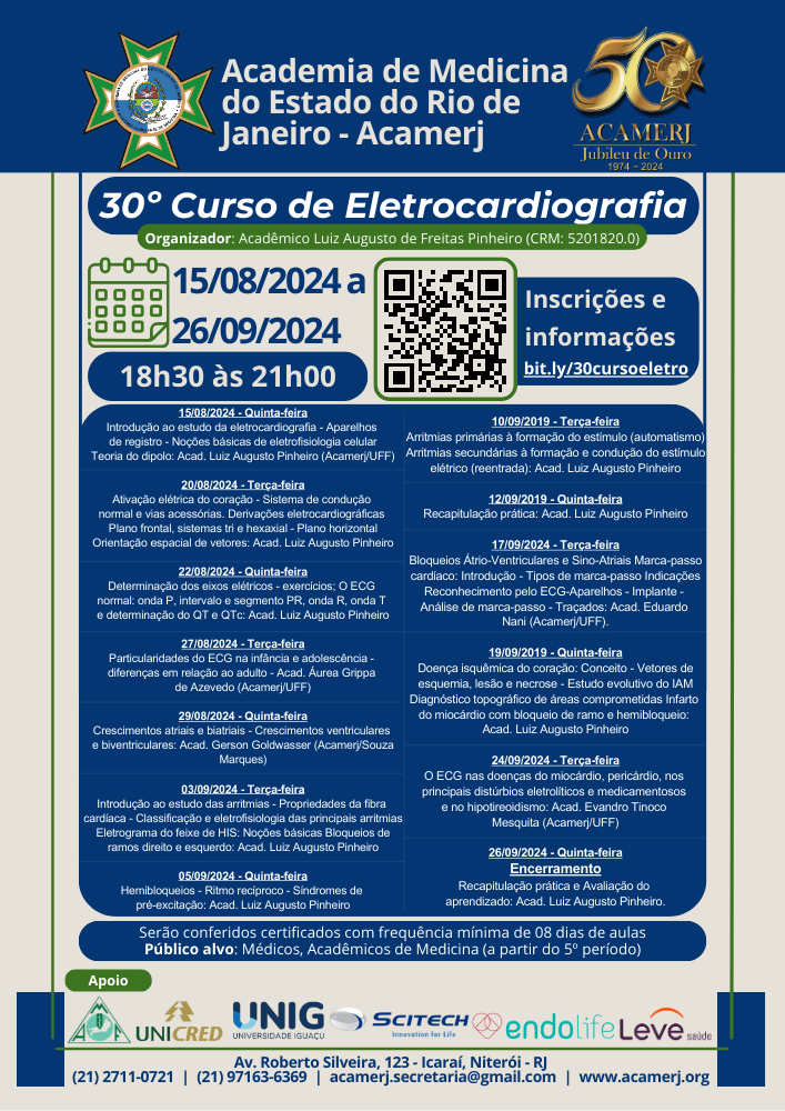 A Academia de Medicina do Estado do Rio de Janeiro (Acamerj) tem o prazer de anunciar a realização do seu 30º Curso de Eletrocardiografia. Este curso, organizado pelo Acadêmico Luiz Augusto de Freitas Pinheiro, está programado para ocorrer de 15 de agosto de 2024 a 26 de setembro de 2024, sempre das 18h30 às 21h00.